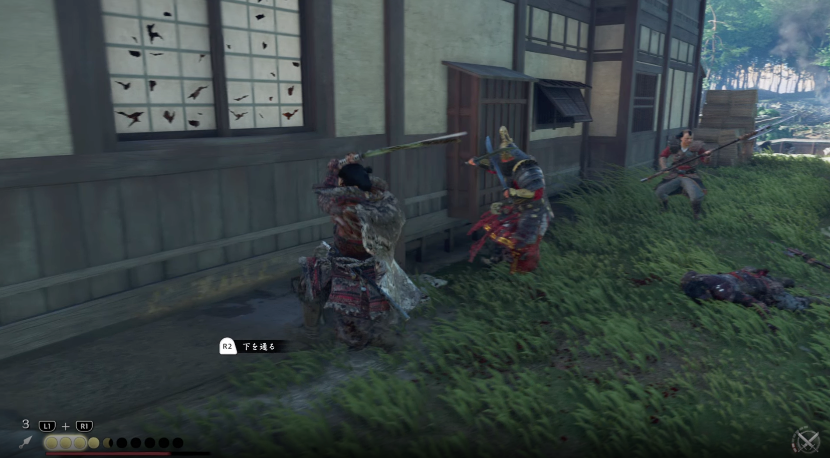 完全なミスです。敵が目の前にいるのに軒下に行こうとするアホな侍がいるでしょうか。いるんです、ここに。後ろから斬られます。こんな間抜け普通死んでます。ダメージを負ったとかじゃなくて。